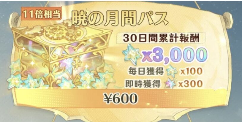 「暁の月間パス(600円)」は、ガチャを引く際に必要となる“エデン光晶”を効率的に入手できる月額課金アイテムで、30日間の累計報酬が合計3,000個(即時獲得300個+毎日100個×30日)となります。